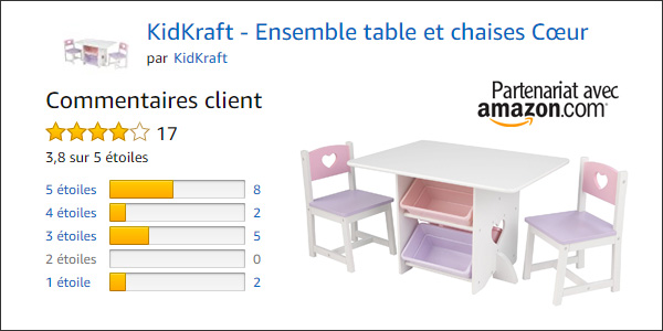 Découvrez ci-après le test complet de l’ensemble table et chaise Kidkraft “coeur”. Un ensemble mobilier pour les enfant très bien pensé et très joli ! Les filles apprécieront les petits cœurs dessinés sur les chaises et la table.